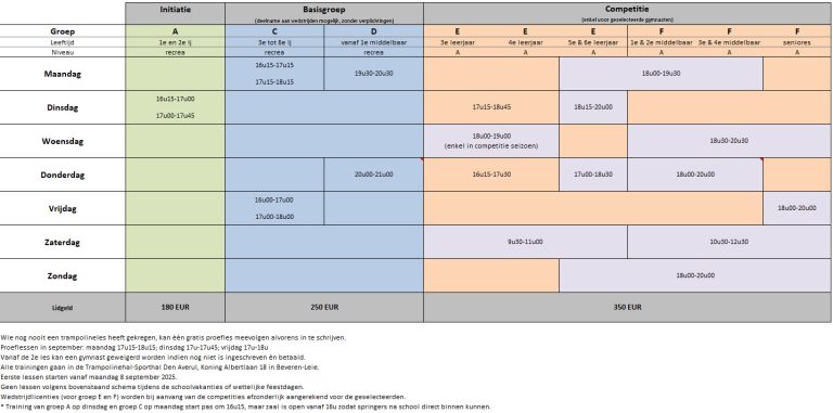 De lessen starten terug vanaf maandag 8 september 2025 en wie nog nooit eerder een trampolineles heeft gekregen, kan één gratis proefles meevolgen alvorens in te schrijven. Proeflessen in 2e week van september op maandag van 17u15 tot 18u15; dinsdag van 17u tot 17u45 en op vrijdag van 17u tot 18u